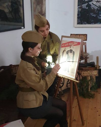 - recreated front-line workshops - photographing in soldier's ginasters and garrison caps in the expositions of the exhibition